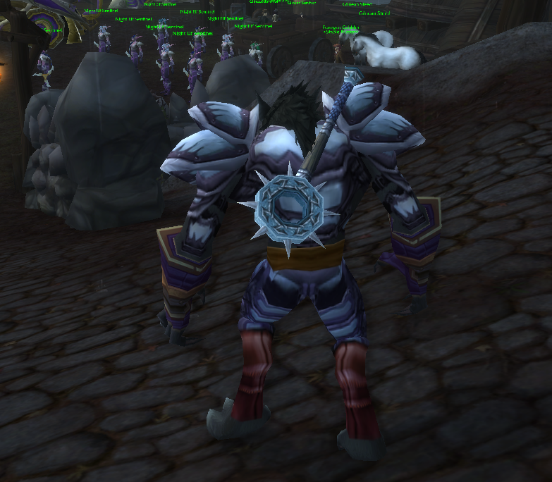 But sometimes I need a break from my monk, so I rolled a couple of new characters, including a worgen druid. I got him through the Gilneas starting zone, and he ended up with the weapon that always amuses me. It looks like a spiked banjo.